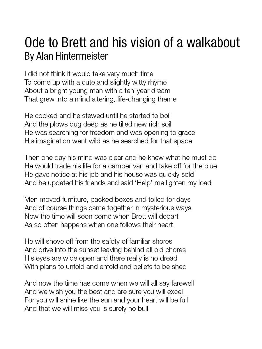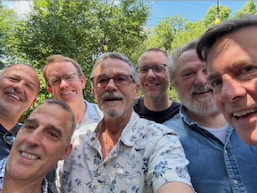 Seven of my friends attended a bon voyage brunch in my honor yesterday. Huge thank yous to Pat Murphy, David Kaar, Derek Presnail, Alan Hintermeister, Peter Piché and Mike Longnecker for attending and especially to host Ron Traxinger, who provided his trademark warm hospitality and great food. (Picture of our handsome crew below.) The best part of the brunch: Each attendee composed a poem in my honor. I can’t imagine a greater gift. Here’s one of them, a proper poem with rhymes and everything.